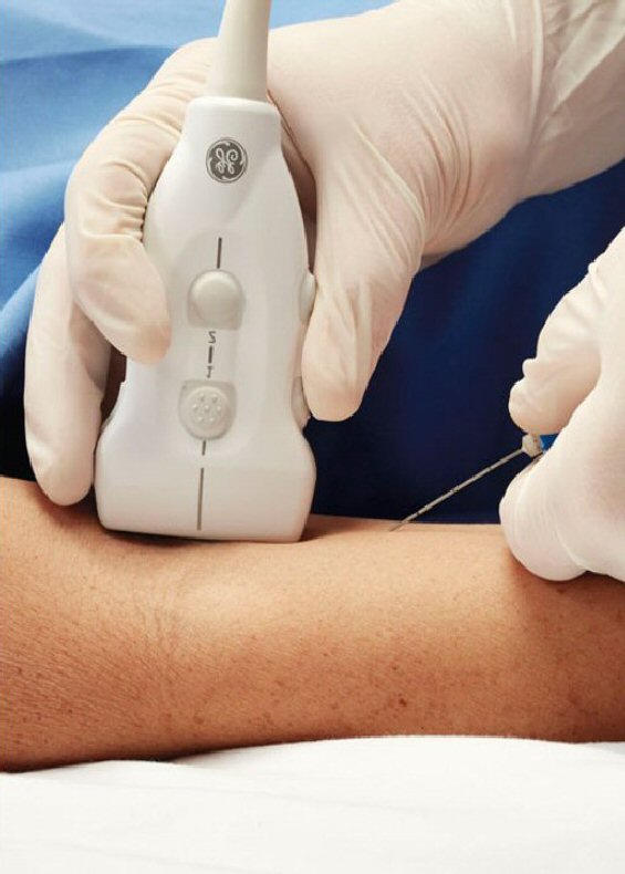 Ο Ιατρός – Ακτινολόγος εισάγει στο σημείο αυτό βελόνα αιμοληψίας, της οποίας η πορεία παρακολουθείται υπερηχογραφικά  ώσπου η άκρη της να εισέλθει στο ογκίδιο το οποίο χρήζει βιοψίας, αποφεύγοντας έτσι  την τρώση παρακείμενων δομών ή αγγείων.